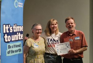 Terry Smith, from Alnwick Friends of the Earth, accepted the award for his boundless enthusiasm for climate action. He has created and distributed his Tipping Point Challenge game, and trained a number of groups across the country. He runs a climate club in the High School in Alnwick, and has an infectious and open minded way of greeting the world.