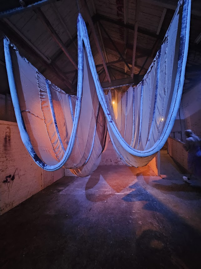 For The Newcastle Late Shows 2025, the historic Coach House in Charlotte Square hosted a living bio sculpture named Pupa. This mycelium-based installation, developed by the BioKnit team, explored how textiles, biotechnology, and architecture can come together. The BioKnit Pupa installation transformed The Coach House into a living laboratory, where fungal mycelium grows and weaves through 3D knitted fabric to form a series of organic arches and canopies.